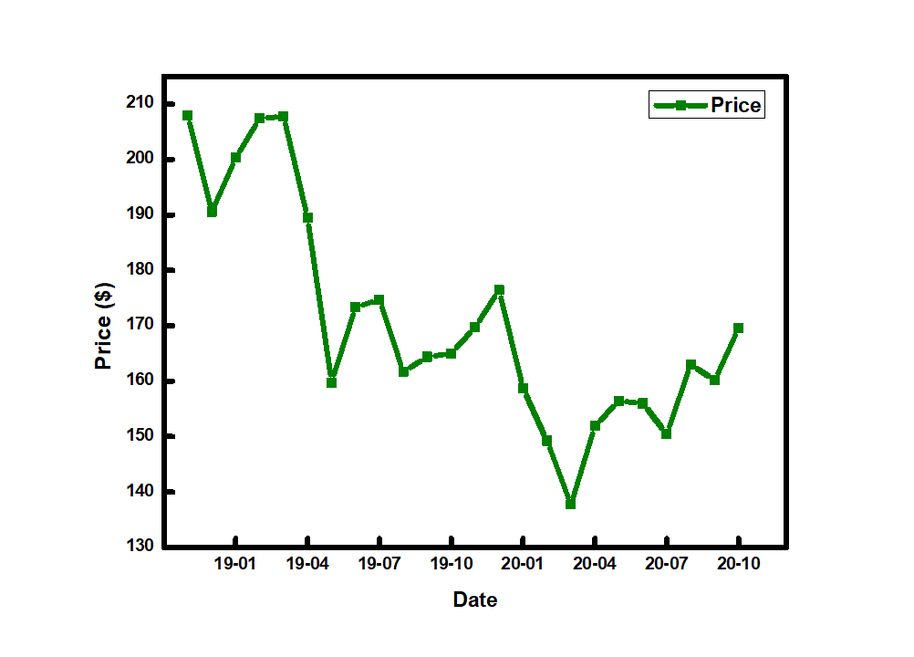 최근 2년간 3M의 주가 변화를 보면 독특한 양상을 보인다. 19년도 1월까지만 해도 190$ 이상의 높은 주가를 유지하지만, 19년도 4월 15%가량의 주가가 떨어진다. COVID-19로 인해서도 주가가 떨어졌었지만 20년도 4월부터 주가를 회복해 나아가고 있다. 19년도 한 차례 COVID-19 보다 더 큰 주가 하락을 겪은 3M, 배당 성향을 알아보자.
