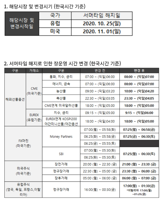 미국 주식 거래시간은 위와 같다. 왼쪽이 서머타임 적용 시 거래 시간으로 오후 10시 30분부터 새벽 5시까지이며, 해지하였을 때 기준 오후 11시 30분부터 오전 6시까지이다. 서머타임 적용 시 한국 투자자의 경우 장의 시작에는 동향을 파악하고, 거래할 수 있으나 장 마감 시에는 거래하기 힘들다는 단점이 있었던 반면, 서머타임 해지 시 반대로 장 시작은 파악하기 어려우나 장 마감 직전에는 동향을 파악하고 거래할 수 있을 것으로 예상된다.