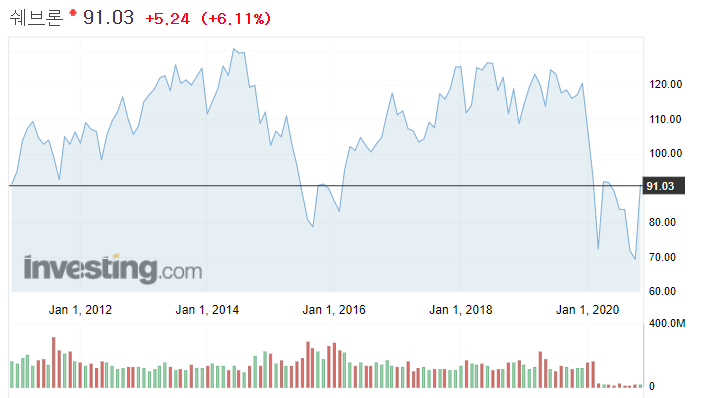 쉐브론의 경우는 약간 다르다. 주가의 경우 2016년 잠시 하락을 겪었으나, 대체적으로 주가는 120$ 이상에서 유지되었었다. 하지만 최근 COVID-19로 인해 많은 변화가 생겼고 그 중 하나가 앞으로 생길 변화의 촉진이다. 이러한 변화 중 하나가 바로 전기차의 도입이고, 그로 인해 쉐브론과 같은 석유 회사는 불안함이 있을 수밖에 없고 조심스레 투자를 하고자 한다.