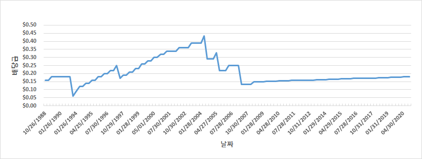 다만 아쉬운 점은 좀 더 Long-term 배당 history를 보면, 배당을 줄인 이력이 있다는 것이다. 특히 2007년 리만 브라더스 사태일 때배당을 큰 폭으로 감소시킨 것을 볼 수 있고, 그 이전에도 배당을 조금씩 줄였던 것을 볼 수 있다. 이는, 경제 상황이 어려웠던 만큼 이해할 수 있는 변화이지만, 배당주를 좋아하는 사람들에겐 배당 컷에 대한 걱정을 야기시킬 수 있는 아쉬운 포인트라고 볼 수 있다.