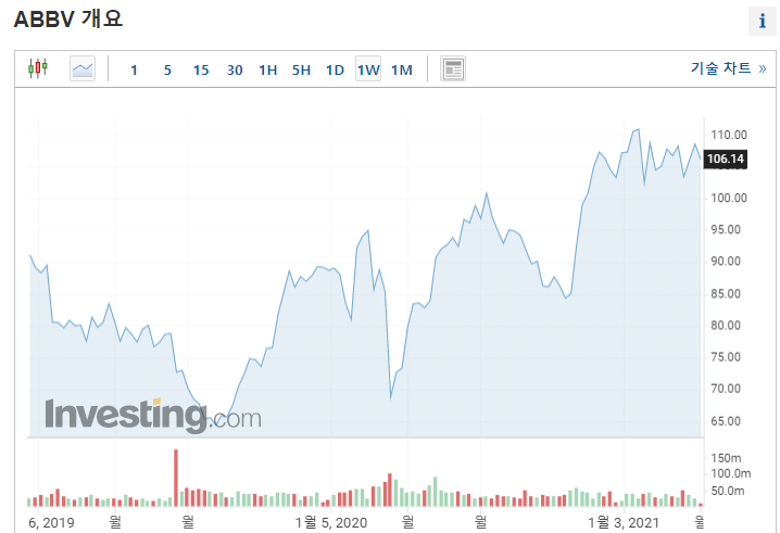 ABBV는 오래된 제약회사로 49년간 배당을 유지시켜온 유래 깊은 기업이다. 현재 배당률은 4.79%로 배당역사에 비해 저상당히 높은 배당률을 가지고 있다. 과거 2018년 최고 주가를 아직까지 회복하진 못한 상태이지만, 조금씩 주가가 오르고 있는 것을 볼 수 있다. 필자의 개인적인 견해로는 49년의 배당 역사와, 배당률 4.79%를 고려했을 때 주가의 상승 또한 기대해볼만하다고 생각한다.