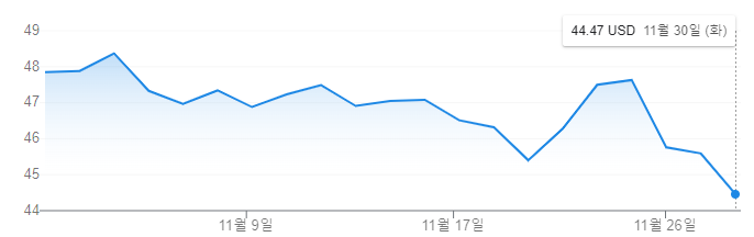 그렇다면 파월의 연임과 오미크론 변이의 공포 속에서 배당주들은 어떤 움직임을 가질까? 대표적으로 미국 금융주 중 가장 유명한 주식 중 하나인 Bank of America를 가져와보았다. 아래 최근 주가 변화와 같이 1년 사이 50%가량 주가가 올라와 있는 상태이다. 미국이 돈을 찍어내는 양적완화를 중단하는 테이퍼링 시작을 언급하고, 2022년부터 금리를 인상할 수 있다는 발언이 나오는 시점부터 가격이 많이 올라온 것이다.